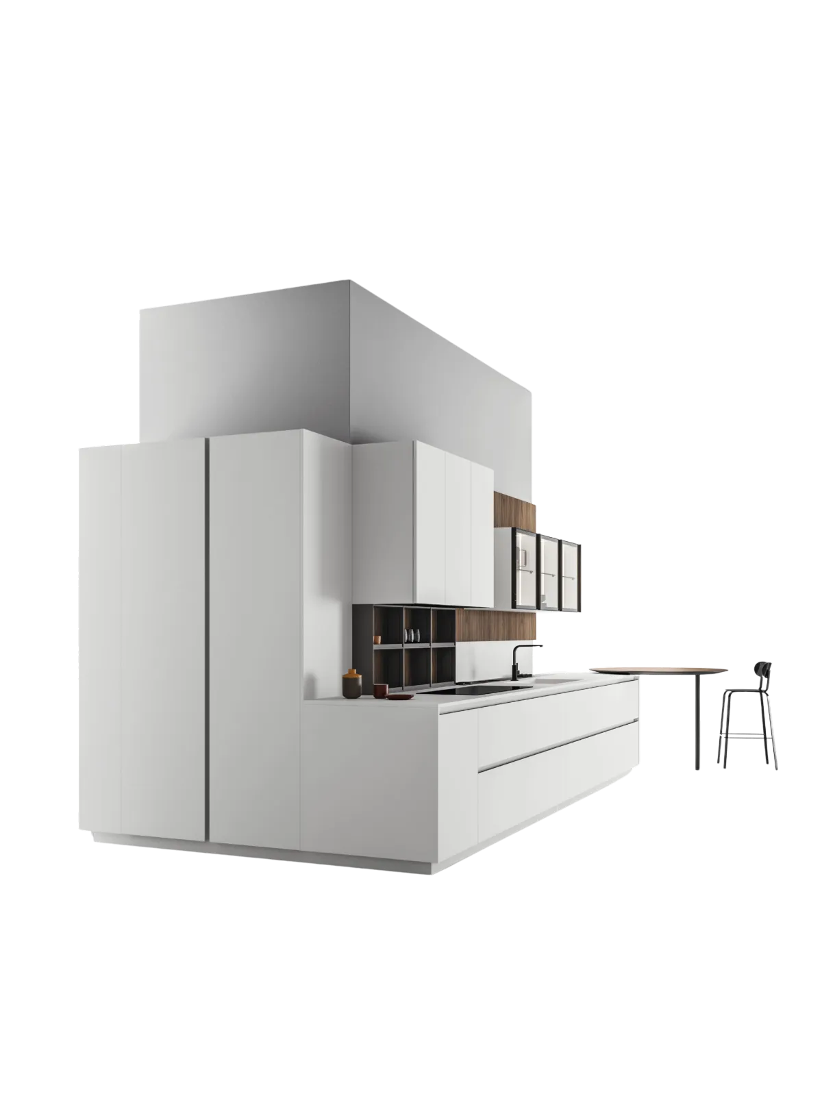 Il vero lusso si manifesta nell'efficienza silenziosa. Sistemi di apertura evoluti, organizzazione interna su misura e soluzioni tecnologiche integrate rendono ogni movimento fluido e ogni gesto culinario un piacere, mantenendo l'ambiente impeccabilmente ordinato ed elegante.